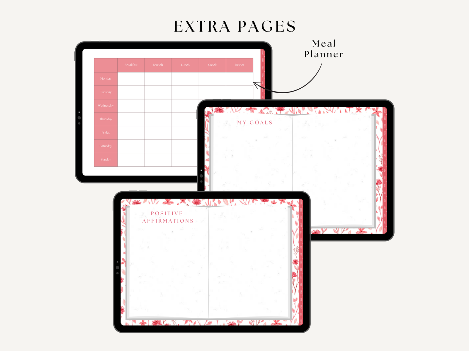 The weekly pages have space for tasks, goals, and notes. Also, to help you stay productive, the planner has extra pages like a class schedule, meal planner, affirmations page, and more. This way, you can keep everything organized in one place.